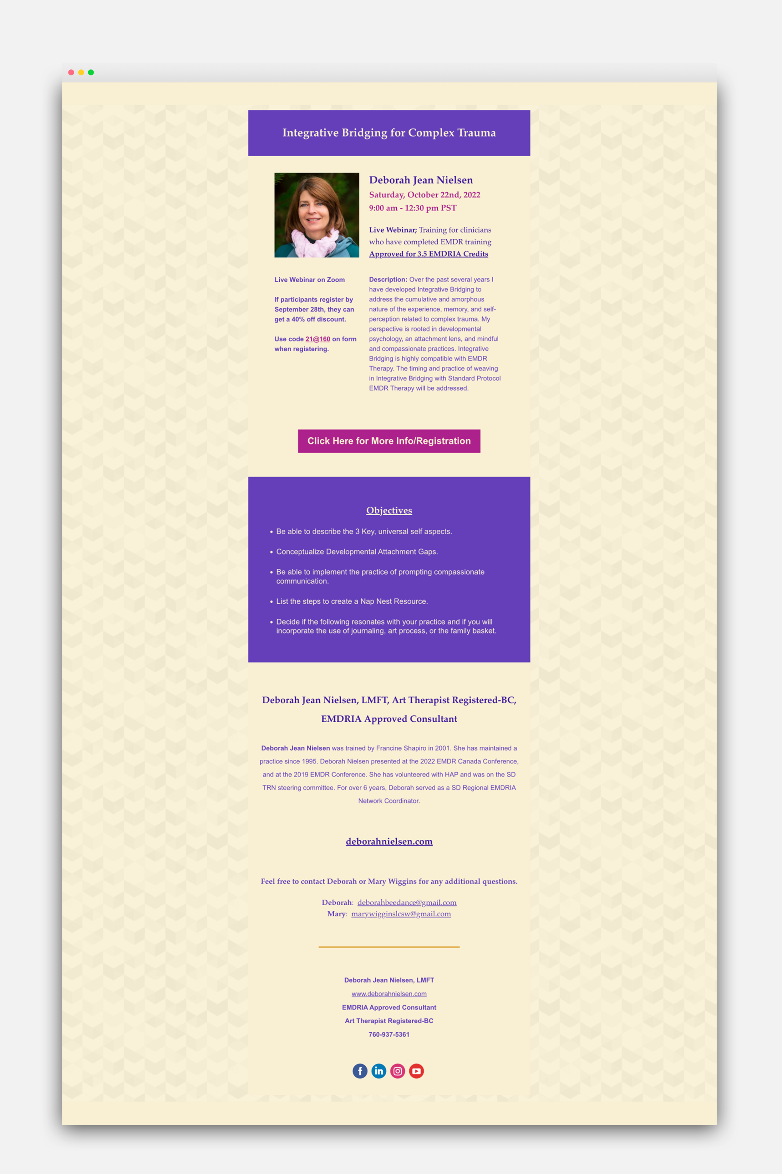 My client Deborah Jean Nielsen needed a branding & website rework and everything here shows the results of our collaborated efforts. I updated her branding to be more inline with her profession & personal philosophy and applied that amongst her website and marketing tools.